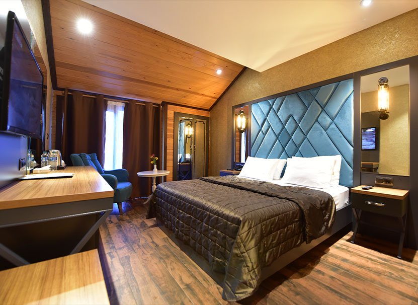 İhtiyaç duyabileceğiniz tüm ayrıntıların düşünüldüğü, bir çift ve 1 tek kişilik yatağın bulunduğu odalar, ahşabın sanatla buluştuğu bir konfor anlayışıyla misafirlerini ağırlıyor.